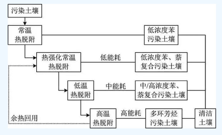 減少能源消耗和提倡使用破壞或降解污染物的修復技術是綠色可持續(xù)修復的原則,采用原地異位修復;在修復技術上,采用逐級熱脫附集成技術。對于低濃度苯污染土壤采用常溫熱脫附技術;對于低濃度苯、萘復合污染土壤采用低能耗的熱強化常溫熱脫附技術;對于中/高濃度苯、萘復合污染土壤采用中能耗的低溫熱脫附技術;對于多環(huán)芳烴污染土壤采用高能耗的高溫熱脫附技術;利用高溫熱脫附的余熱進行熱強化常溫熱脫附,實現(xiàn)余熱回用,提高能源利用效率。通過采用精細化熱脫附集成修復技術,大幅減少了高溫熱脫附技術處理的土方量,降低了能耗和環(huán)境足跡,提高了能源利用效率。
